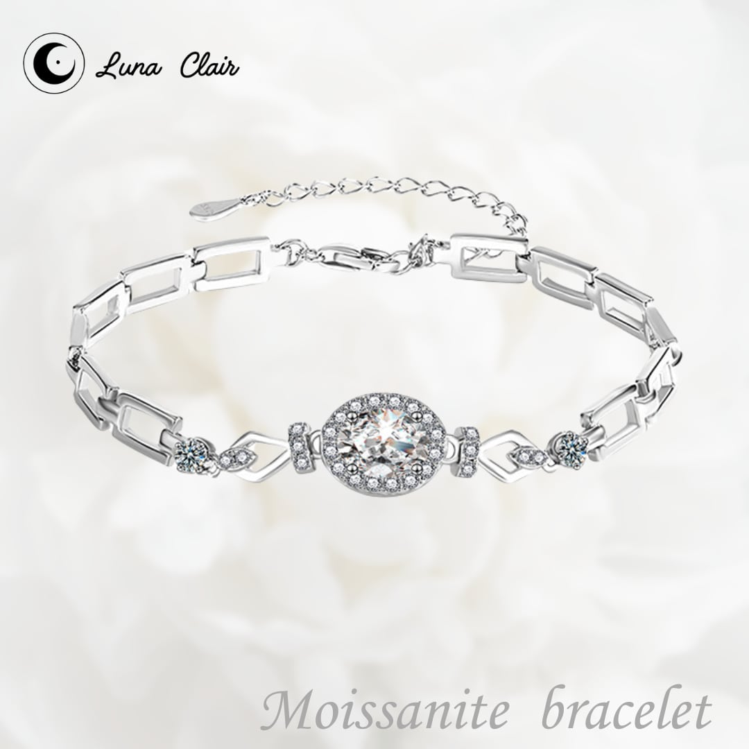 ブレスレットの中心には1ctのオーバルカットモアサナイトをセットし、小さくて繊細なストーンが周囲を囲み、その輝きを放ちます。