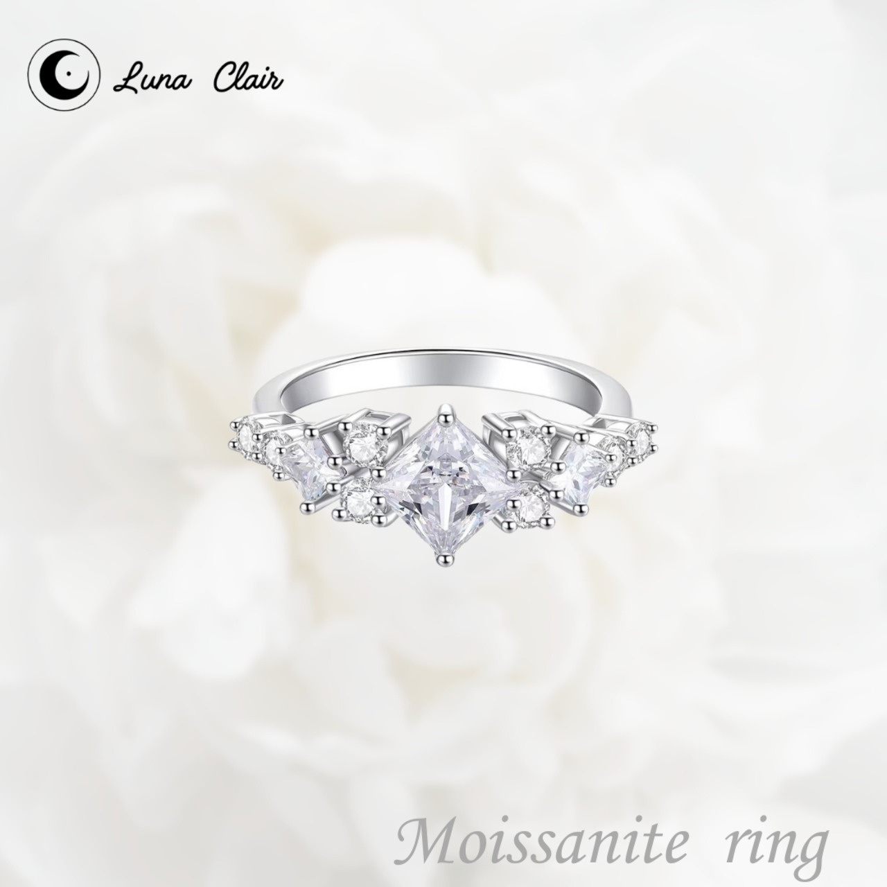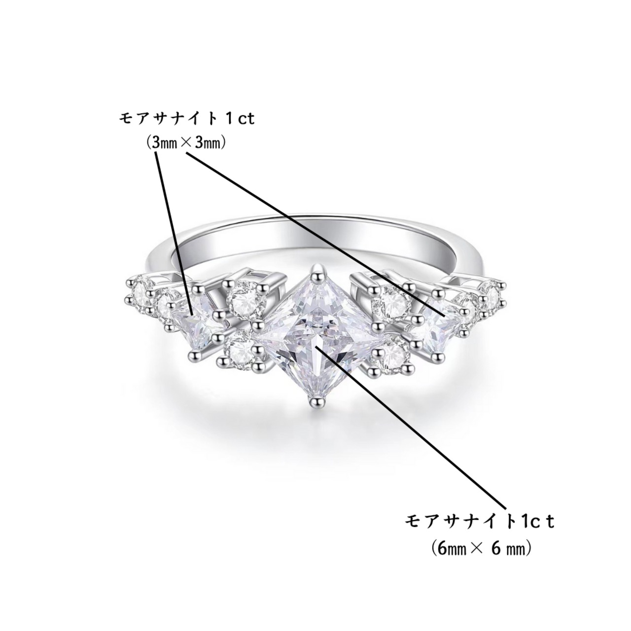 中央に輝くのは、6mm×6mm・1ctのプリンセスカットモアサナイト。