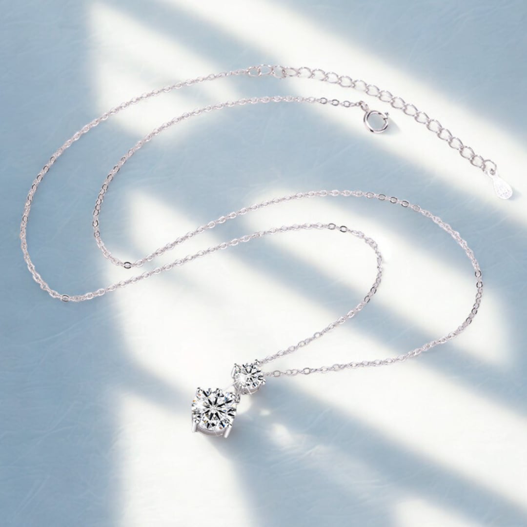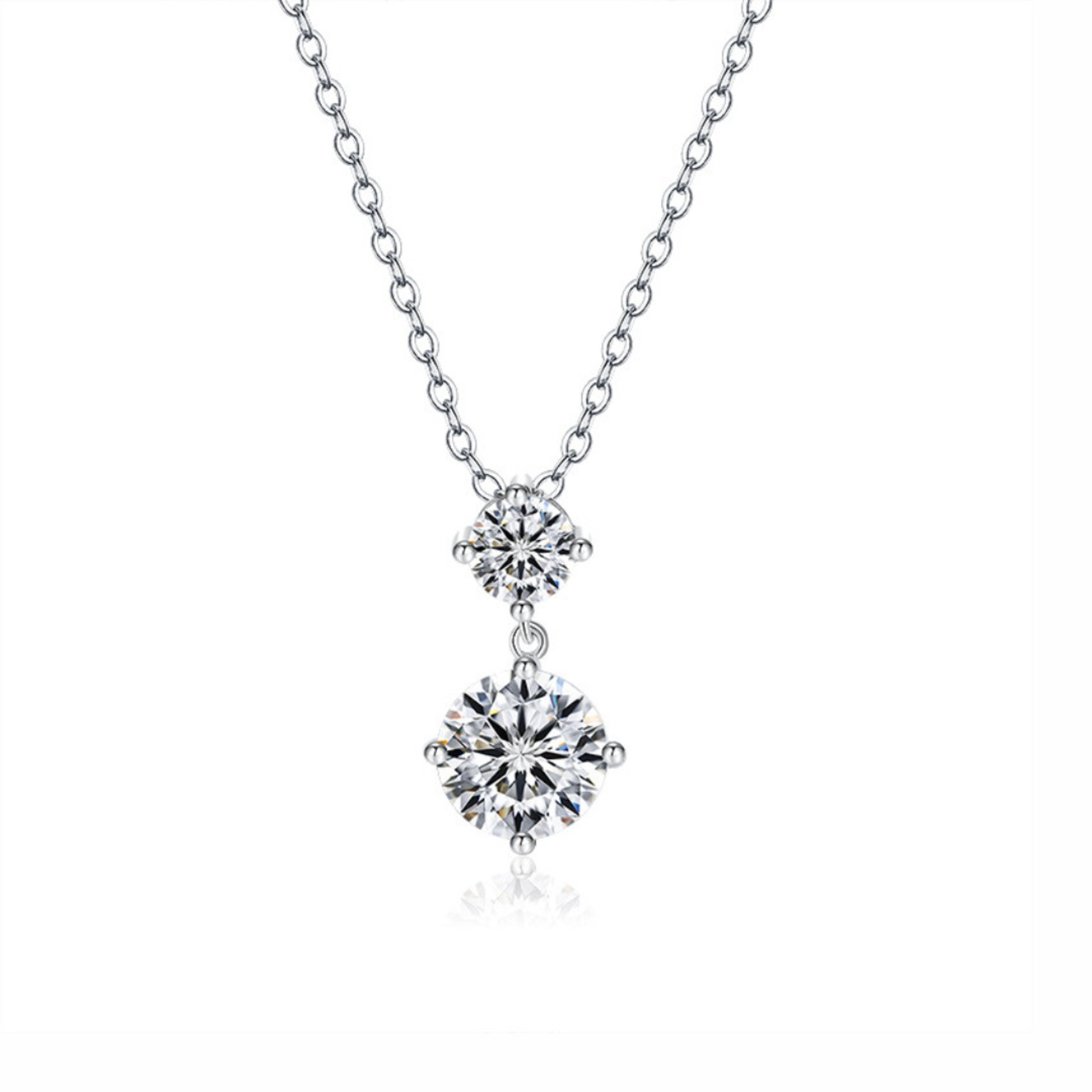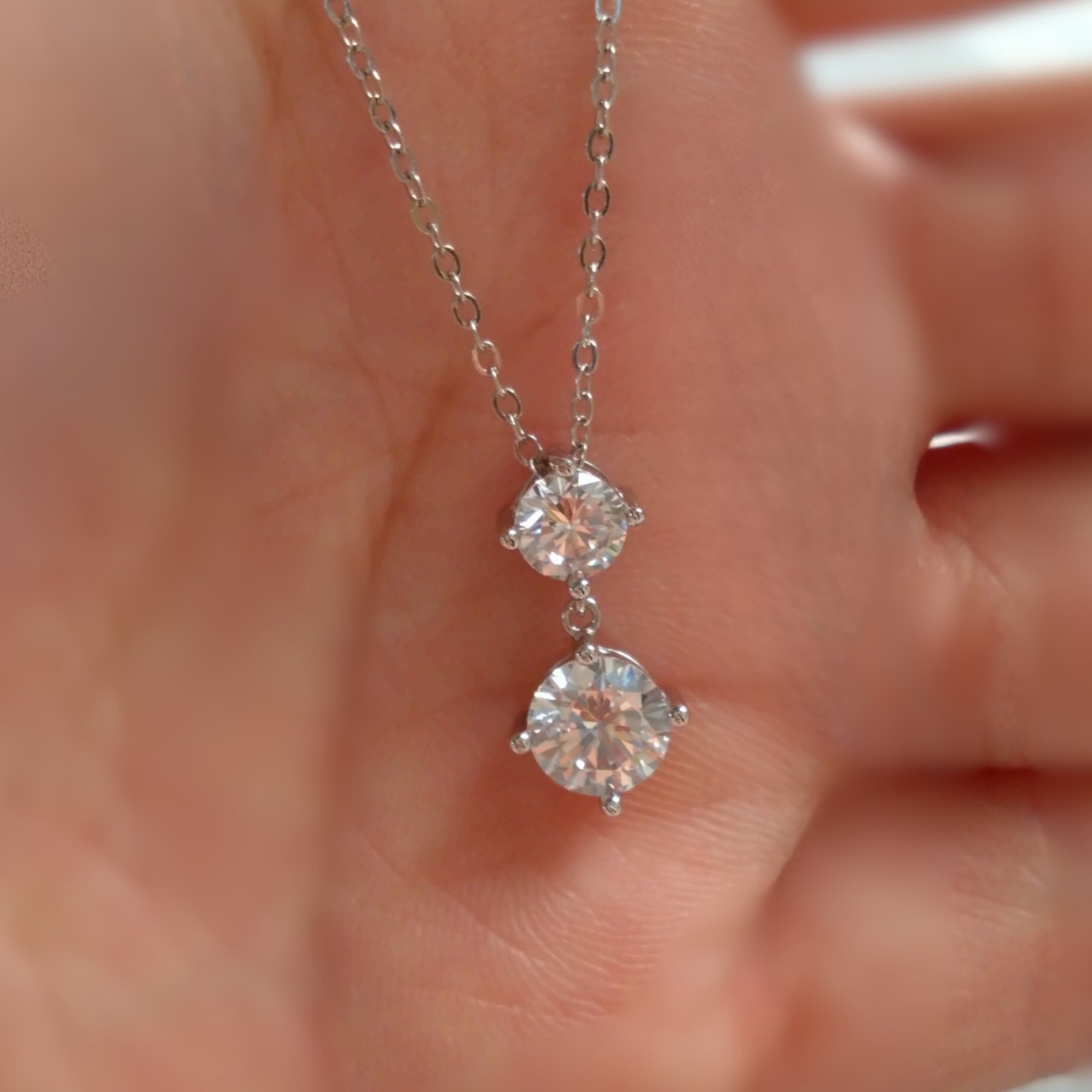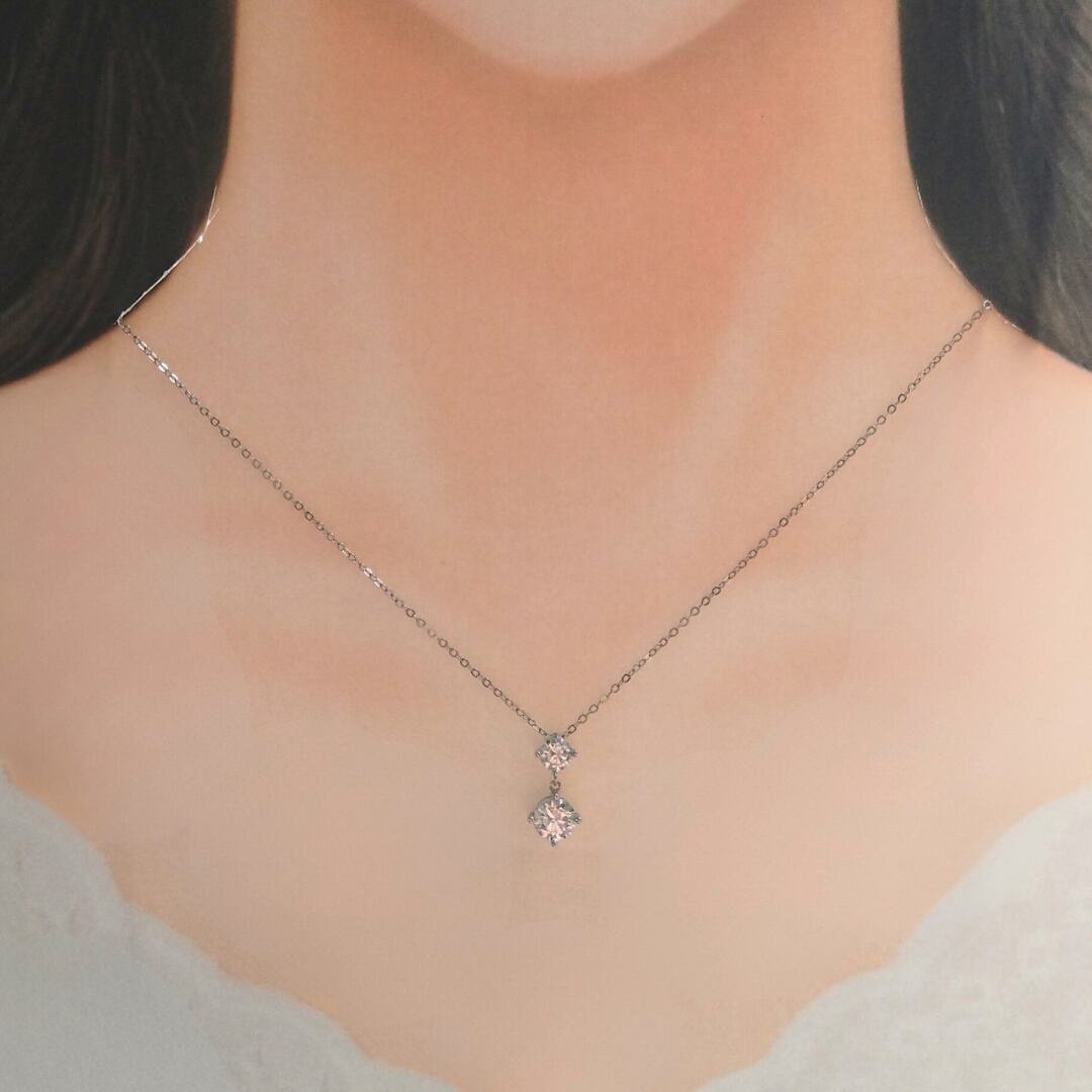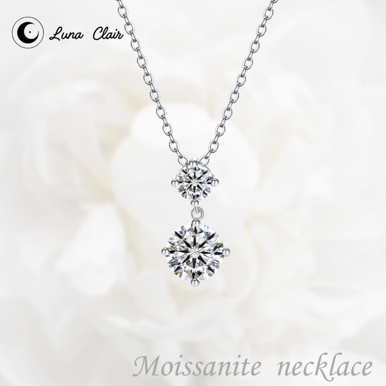 着用時の美しさにこだわったデザイン設計。首元に自然にフィットし、動くたびに2粒のモアサナイトが優雅に揺れて輝きます。