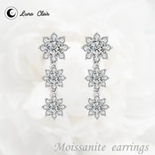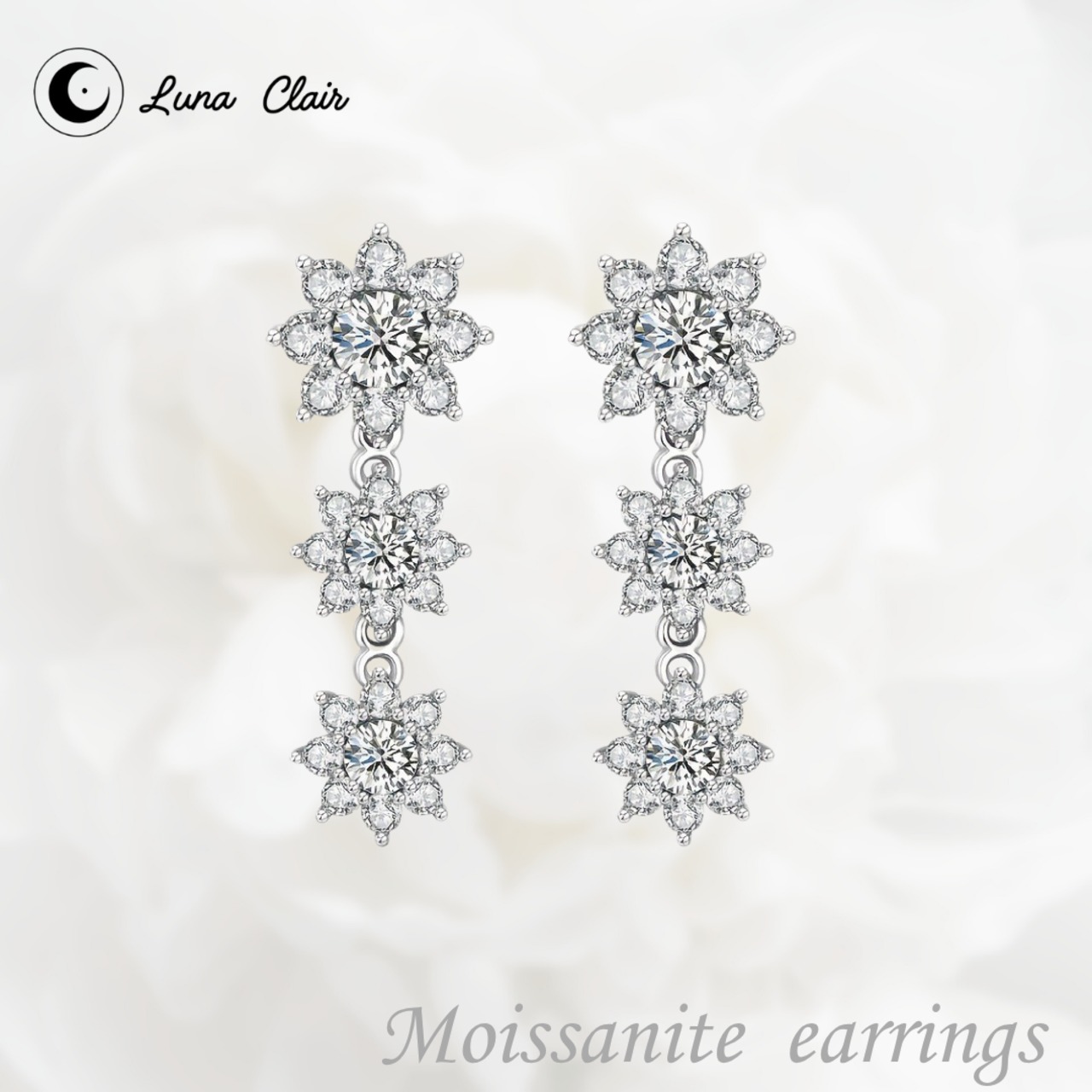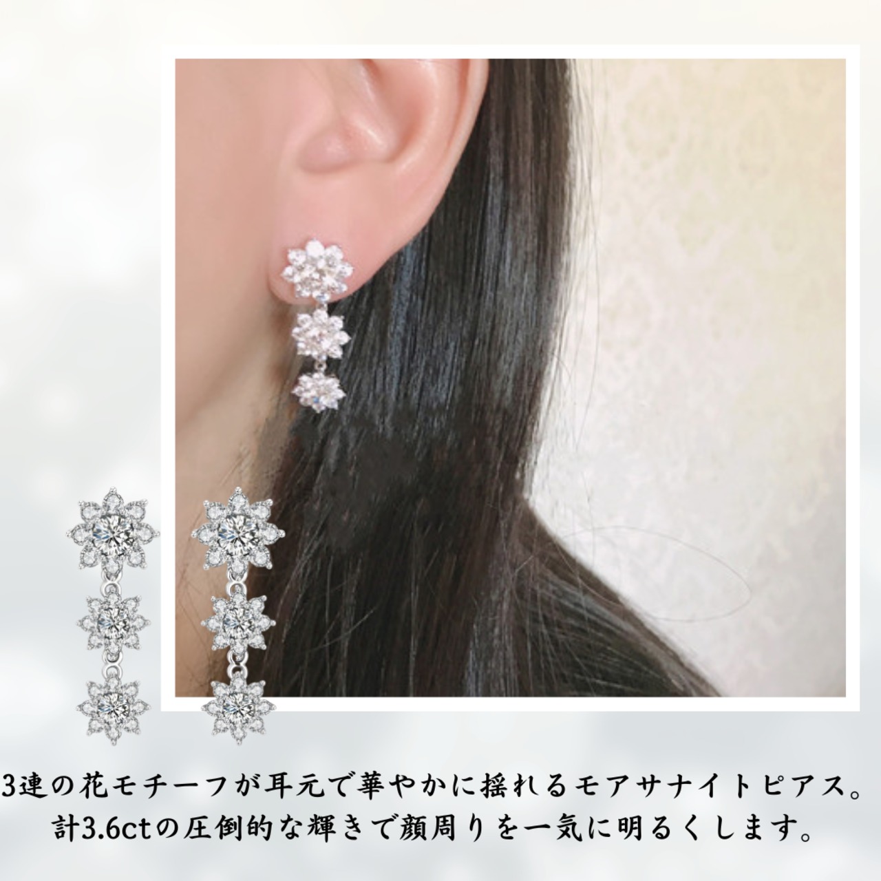 まばゆい輝きを放つモアサナイトを3石贅沢に連ねた、圧巻のドロップピアス。