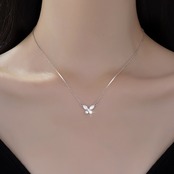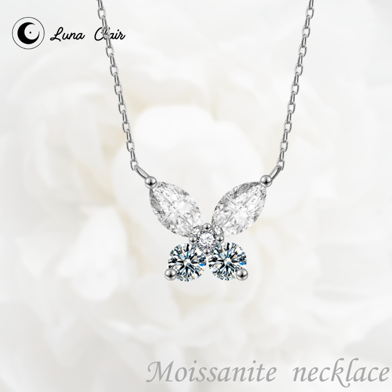 モアサナイトとキュービックジルコニアを組み合わせた、美しく繊細な蝶モチーフのネックレス。